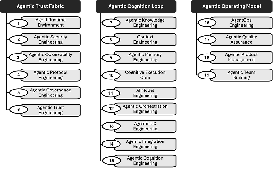 Agentic Engineering consists of 19 engineering practice areas.
