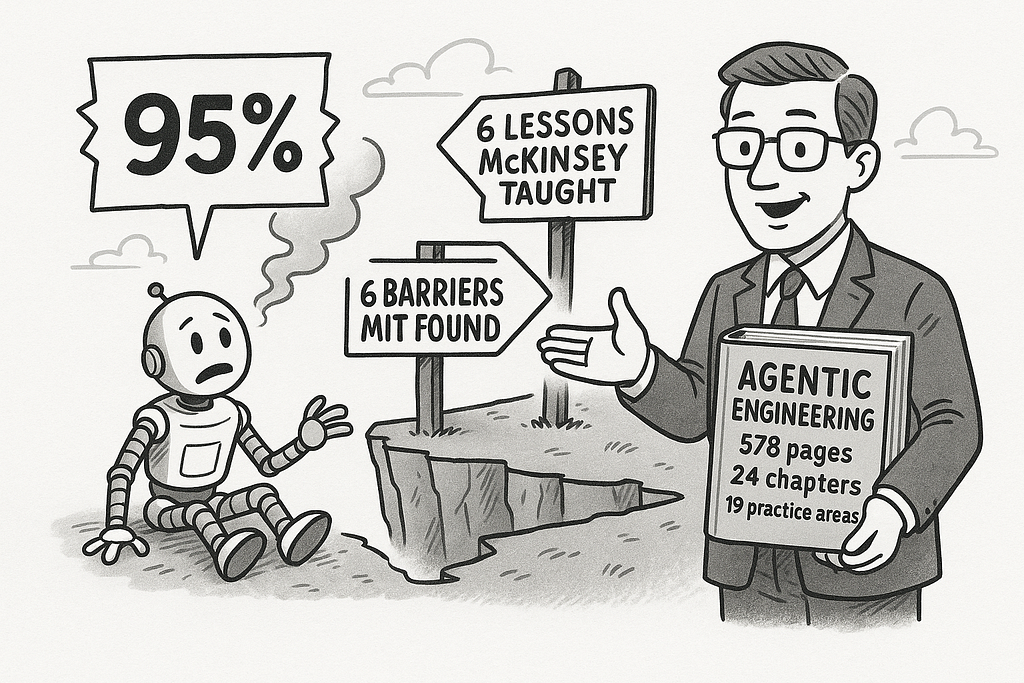 Across 24 chapters and 19 practice areas, my new book delivers a full blueprint — complete with the Agentic Stack, maturity ladders, design patterns and anti-patterns, field lessons, best practices, case studies, and code examples. Every chapter is designed to seal fault lines MIT exposed while embedding the survival principles McKinsey taught.