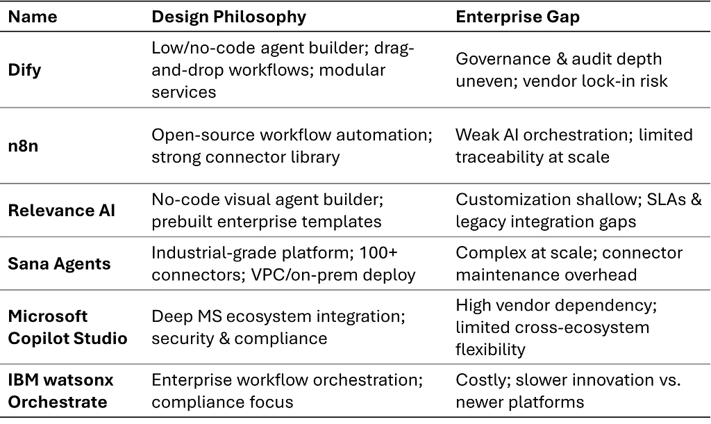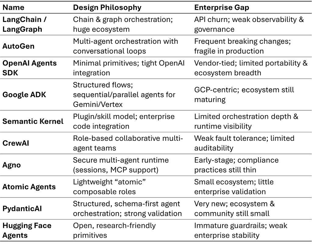 To understand the battlefield, you have to understand the players. Here’s how the major agentic frameworks and platforms line up today: what they optimize for, and where they fall short when enterprises push them into production.
