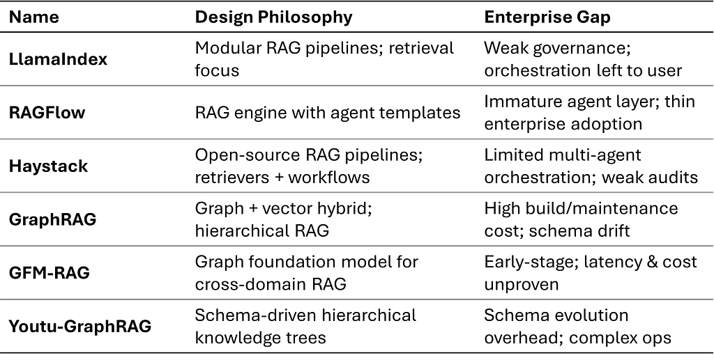 This group focuses on retrieval-augmented generation (RAG) and its new wave of graph-enhanced variants. They specialize in knowledge ingestion, indexing, and context retrieval — the backbone of many enterprise agents. Their weakness: they often stop at retrieval, leaving orchestration, governance, and fault-tolerance to the user.