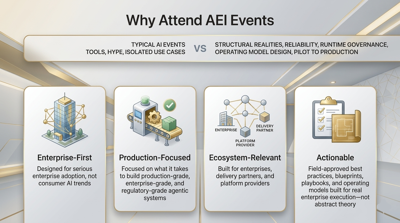 Join AEI webinars, executive briefings, and ecosystem events to accelerate agentic AI from pilot to production value.